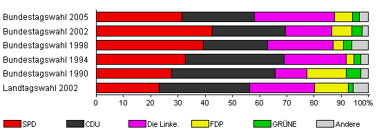 | Bundestagswahl 2005 | 65,5 | 31,4 | 26,7 | 29,4 | 6,5 | 2,6 | 3,4 | |