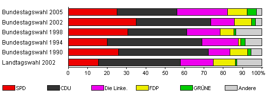 | Bundestagswahl 2005 | 76,0 | 25,0 | 31,0 | 26,2 | 10,1 | 4,8 | 3,0 | |