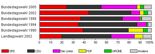 | Bundestagswahl 2005 | 76,1 | 24,0 | 31,0 | 32,0 | 3,0 | 3,0 | 7,0 | |