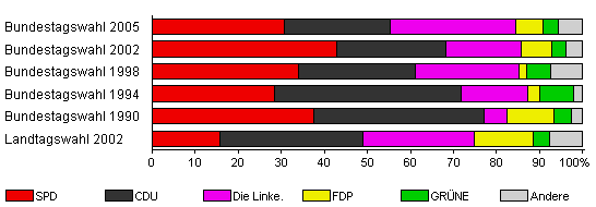 | Bundestagswahl 2005 | 65,6 | 30,8 | 24,4 | 29,2 | 6,4 | 3,6 | 5,6 | |