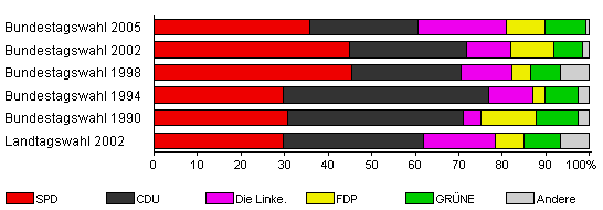 | Landtagswahl 2002 | 54,6 | 29,8 | 32,0 | 16,6 | 6,6 | 8,3 | 6,6 | |