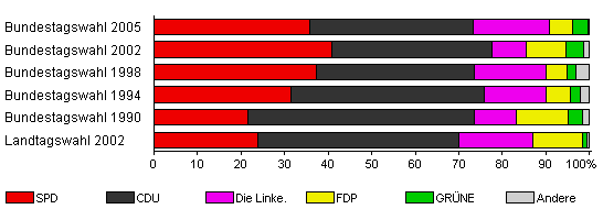 | Bundestagswahl 2005 | 67,8 | 35,8 | 37,6 | 17,5 | 5,2 | 3,5 | 0,4 | |