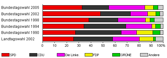 | Landtagswahl 2002 | 45,4 | 25,6 | 32,6 | 22,0 | 11,5 | 1,9 | 6,4 | |