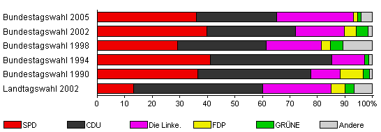 | Landtagswahl 2002 | 57,0 | 13,3 | 46,7 | 25,0 | 5,0 | 3,3 | 6,7 | |