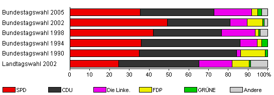 | Bundestagswahl 2005 | 69,5 | 35,4 | 37,3 | 19,0 | 3,2 | 1,9 | 3,2 | |