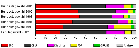 | Bundestagswahl 2005 | 74,5 | 35,5 | 34,3 | 18,4 | 7,2 | 2,0 | 2,6 | |