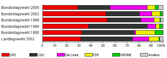 | Bundestagswahl 2002 | 64,7 | 52,6 | 27,6 | 10,3 | 6,9 | 1,7 | 0,9 | |