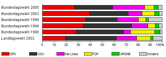 | Bundestagswahl 2005 | 74,1 | 27,0 | 31,7 | 26,6 | 7,8 | 3,4 | 3,4 | |