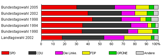 | Landtagswahl 2002 | 60,1 | 17,8 | 35,6 | 17,4 | 23,1 | 2,4 | 3,6 | |