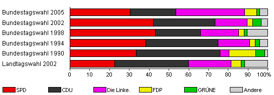 | Bundestagswahl 2005 | 63,4 | 30,5 | 22,9 | 34,8 | 6,2 | 1,4 | 4,3 | |