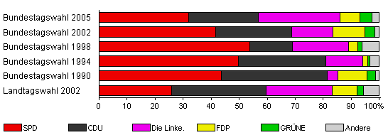 | Landtagswahl 2002 | 51,1 | 25,8 | 33,7 | 23,6 | 9,0 | 2,2 | 5,6 | |