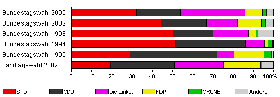 | Bundestagswahl 2005 | 66,8 | 32,1 | 21,6 | 32,1 | 8,6 | 1,9 | 3,7 | |