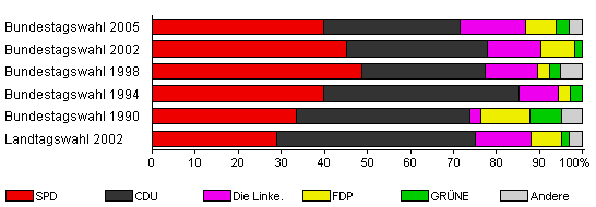 | Bundestagswahl 2005 | 72,1 | 39,8 | 31,6 | 15,3 | 7,1 | 3,1 | 3,1 | |