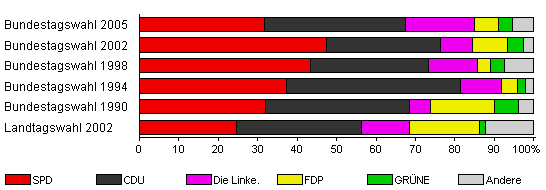 | Bundestagswahl 2005 | 66,9 | 31,8 | 35,6 | 17,6 | 6,1 | 3,4 | 5,4 | |