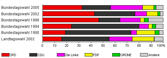 | Bundestagswahl 2005 | 75,5 | 32,7 | 23,7 | 26,6 | 9,0 | 2,2 | 5,8 | |