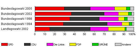 | Landtagswahl 2002 | 62,0 | 14,9 | 41,0 | 18,1 | 16,8 | 1,5 | 7,6 | |