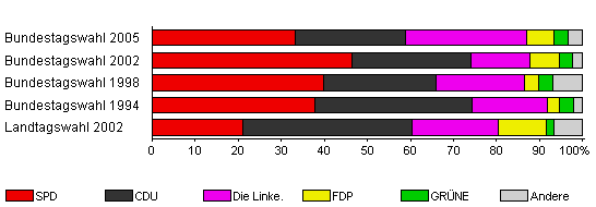 | Bundestagswahl 2005 | 71,3 | 33,3 | 25,5 | 28,1 | 6,3 | 3,5 | 3,2 | |
