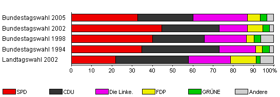 | Landtagswahl 2002 | 55,8 | 21,8 | 35,9 | 21,0 | 12,6 | 2,0 | 6,7 | |