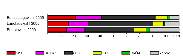 | Landtagswahl 2006 | 50,2 | 15,8 | 14,8 | 49,5 | 7,9 | 1,0 | 11,0 | |