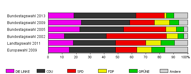 | Landtagswahl 2011 | 52,5 | 17,9 | 30,3 | 21,7 | 10,8 | 9,8 | 9,5 | |