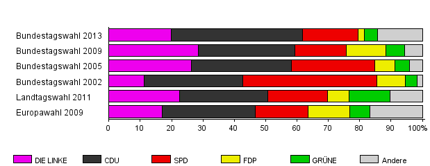 | Landtagswahl 2011 | 54,5 | 22,5 | 28,2 | 19,0 | 7,0 | 13,0 | 10,3 | |