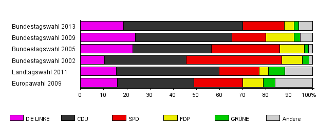 | Bundestagswahl 2013 | 58,6 | 18,6 | 51,3 | 17,9 | 4,3 | 1,9 | 6,0 | |
