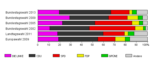 | Landtagswahl 2011 | 55,4 | 17,9 | 41,6 | 19,6 | 3,3 | 5,4 | 12,3 | |