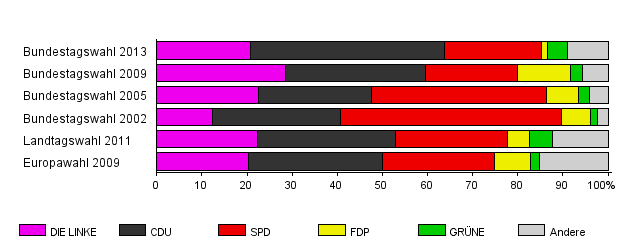 | Bundestagswahl 2013 | 51,8 | 20,8 | 42,9 | 21,5 | 1,3 | 4,4 | 9,1 | |
