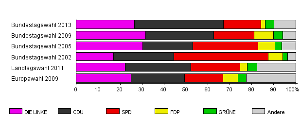 | Bundestagswahl 2013 | 59,3 | 26,6 | 40,4 | 17,2 | 1,9 | 4,1 | 9,7 | |