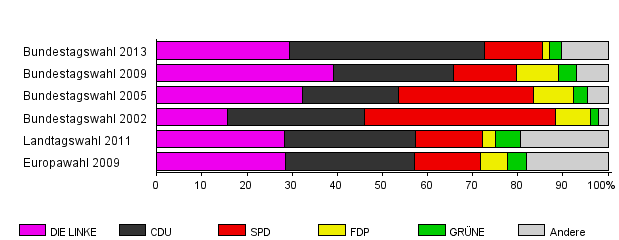 | Bundestagswahl 2013 | 57,0 | 29,5 | 43,2 | 12,8 | 1,5 | 2,6 | 10,3 | |