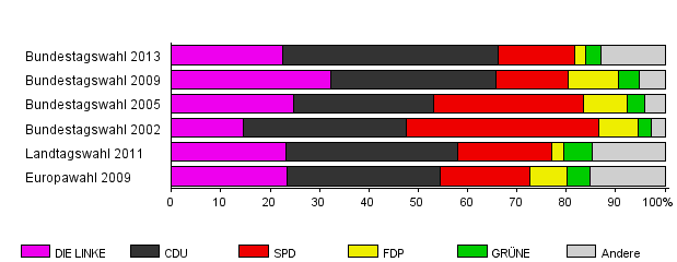 | Bundestagswahl 2013 | 58,9 | 22,6 | 43,6 | 15,4 | 2,2 | 3,2 | 13,0 | |