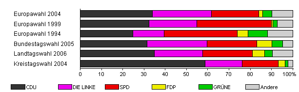 | Landtagswahl 2006 | 50,3 | 34,8 | 22,8 | 23,4 | 5,7 | 3,8 | 9,5 | |
