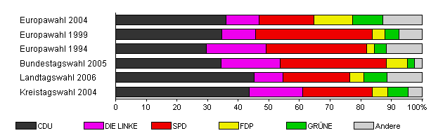 | Kreistagswahl 2004 | 49,6 | 43,6 | 17,4 | 22,9 | 5,0 | 6,6 | 4,4 | |