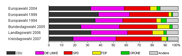 | Kreistagswahl 2007 | 40,5 | 18,9 | 32,9 | 35,1 | 4,3 | 0,8 | 8,0 | |