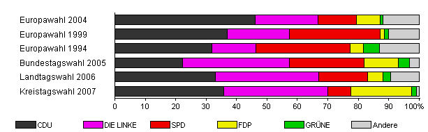 | Kreistagswahl 2007 | 38,4 | 35,9 | 34,1 | 7,7 | 19,9 | 1,5 | 0,9 | |