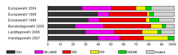 | Kreistagswahl 2007 | 44,4 | 39,7 | 17,4 | 18,7 | 19,3 | 4,2 | 0,6 | |