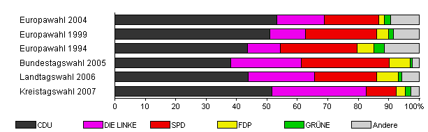 | Kreistagswahl 2007 | 45,0 | 51,7 | 30,9 | 9,9 | 3,0 | 1,9 | 2,6 | |