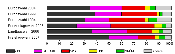 | Kreistagswahl 2007 | 31,5 | 49,9 | 23,3 | 13,9 | 3,2 | 4,4 | 5,2 | |