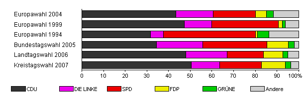 | Kreistagswahl 2007 | 27,6 | 50,5 | 13,0 | 19,4 | 10,9 | 2,7 | 3,5 | |