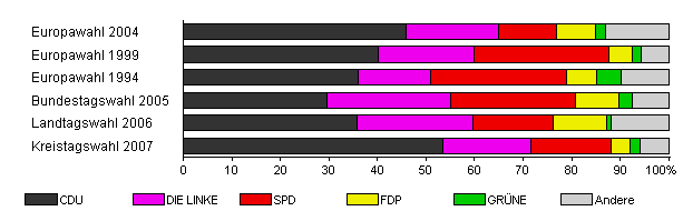 | Kreistagswahl 2007 | 46,0 | 53,4 | 18,2 | 16,6 | 3,9 | 2,0 | 5,9 | |