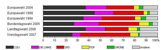 | Kreistagswahl 2007 | 44,1 | 25,2 | 7,1 | 43,6 | 7,3 | 1,1 | 15,6 | |