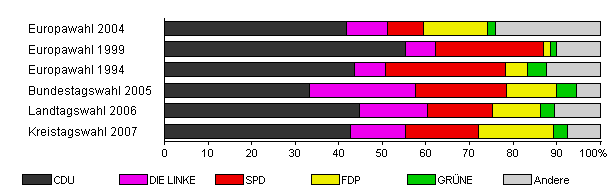| Kreistagswahl 2007 | 35,1 | 42,6 | 12,8 | 16,6 | 17,2 | 3,2 | 7,6 | |