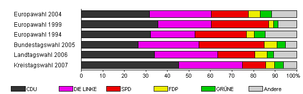 | Kreistagswahl 2007 | 38,2 | 45,3 | 29,6 | 10,8 | 4,0 | 4,1 | 6,2 | |