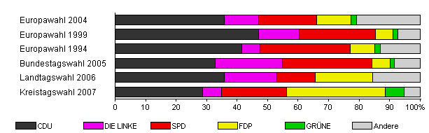 | Landtagswahl 2006 | 51,2 | 35,9 | 17,2 | 12,5 | 18,8 | - | 15,6 | |