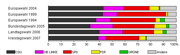 | Kreistagswahl 2007 | 42,4 | 39,1 | 6,2 | 25,6 | 5,4 | 0,3 | 23,5 | |