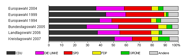 | Kreistagswahl 2007 | 39,5 | 50,7 | 13,8 | 14,9 | 5,2 | 8,5 | 7,0 | |
