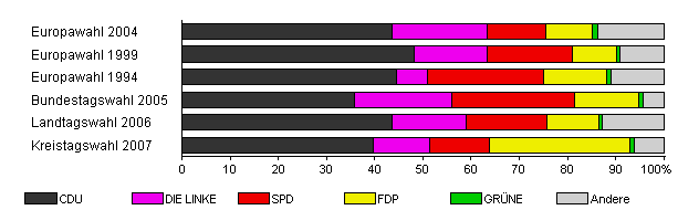 | Landtagswahl 2006 | 55,8 | 43,7 | 15,3 | 16,8 | 10,8 | 0,7 | 12,7 | |