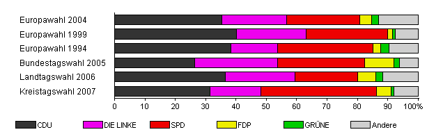 | Kreistagswahl 2007 | 32,1 | 31,5 | 16,6 | 38,2 | 4,9 | 0,9 | 8,0 | |