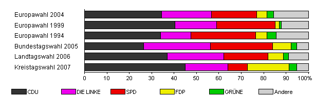 | Kreistagswahl 2007 | 34,5 | 44,9 | 19,1 | 8,8 | 18,5 | 3,4 | 5,3 | |