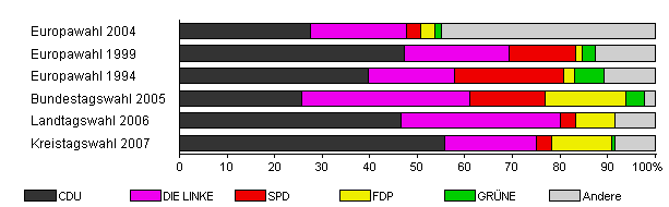 | Kreistagswahl 2007 | 46,1 | 55,8 | 19,2 | 3,2 | 12,8 | 0,6 | 8,3 | |